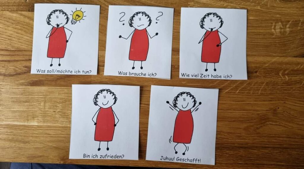 Durch die Visualisierung einzelner Handlungsschritte können Kinder (und auch Erwachsene) dabei unterstützt werden, Handlungen zu planen, umzusetzen und zu reflektieren.